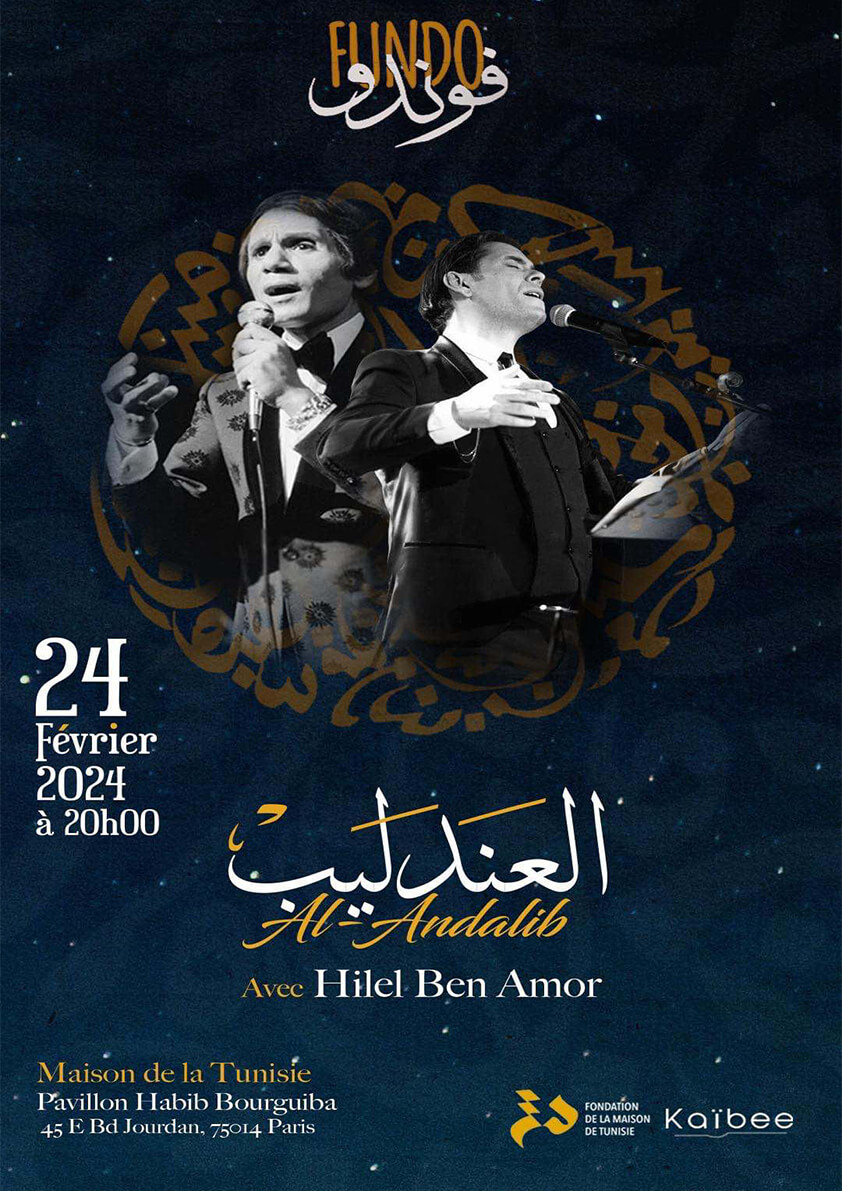 Embarquez avec nous pour un voyage mélomane où les notes deviennent des poèmes, célébrant la beauté intemporelle des œuvres des maîtres compositeurs tels que Mohamed Abdelwahab محمد عبد الوهاب, Baligh Hamdi بليغ حمدي, Mohamed Mouji محمد الموجي, et Kamel Altawil كمال الطويل. Les murs du concert résonneront des échos nostalgiques des chansons éternelles du Andalib العندليب, empreintes d’une poésie qui transcende le temps.