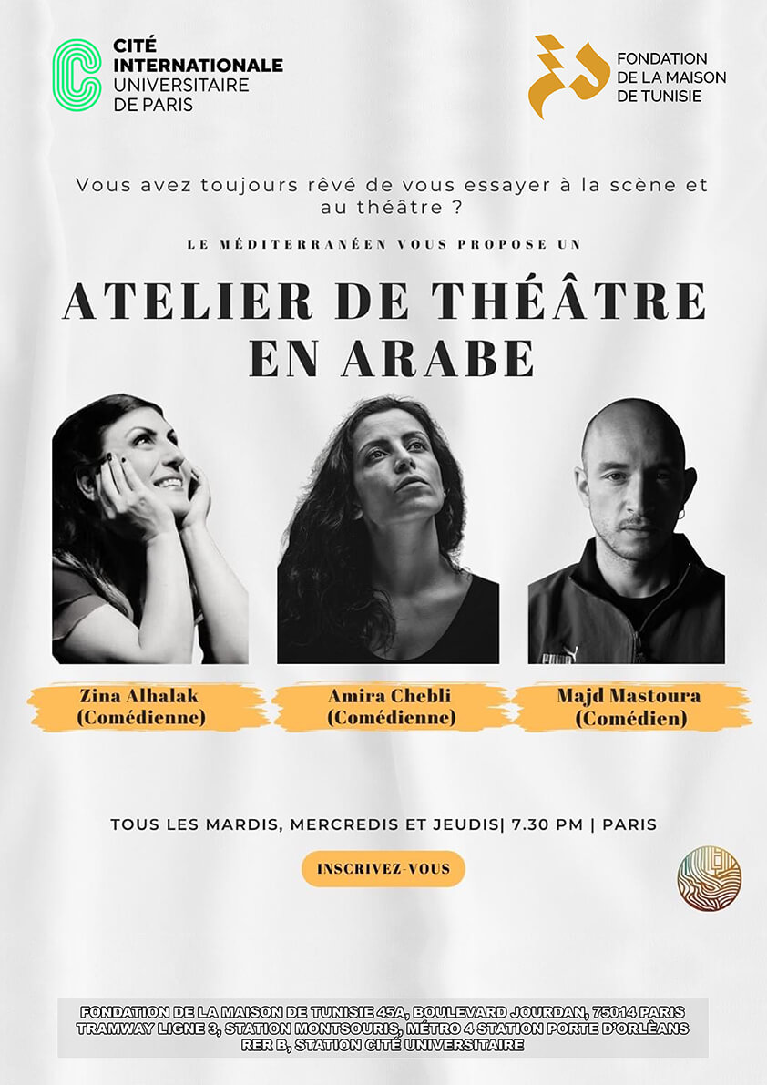 Rejoignez-nous dans cette aventure passionnante, animée par les comédiens Alhalak Zina, Majd Mastoura et Amira Chebli. Ils apporteront leur expertise et leur passion pour le théâtre pour vous guider dans un voyage extraordinaire à travers les arts de la scène.