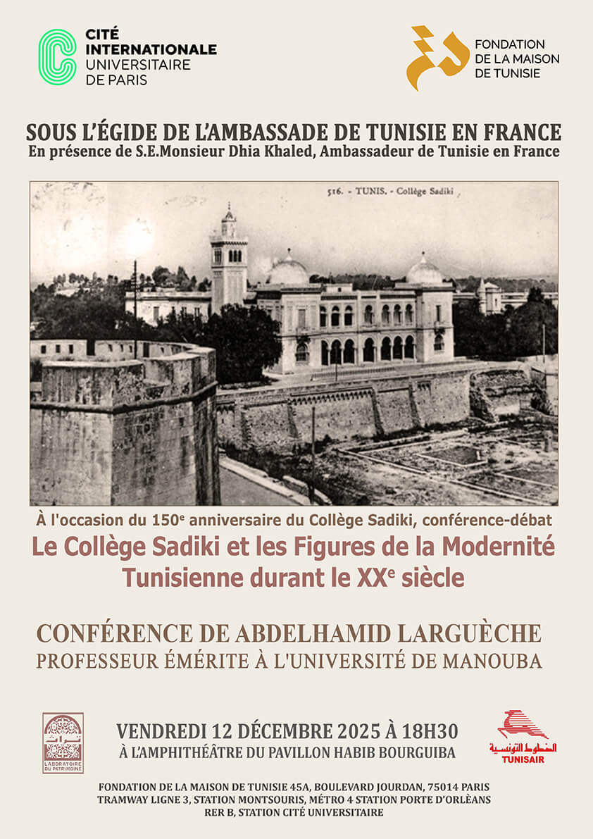 La Maison de Tunisie a le plaisir de vous inviter à une conférence sur l’histoire et l’héritage du Collège Sadiki, à l’occasion de son 150ème anniversaire.