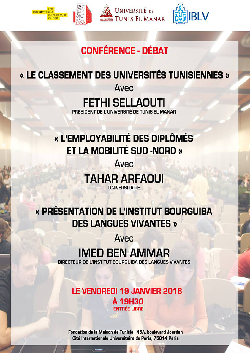 La maison de Tunisie a le plaisir de vous proposer une Conférence-débat le vendredi 19 janvier 2018 à 19H30 avec des Universitaires qui présente des conférences intitulées: