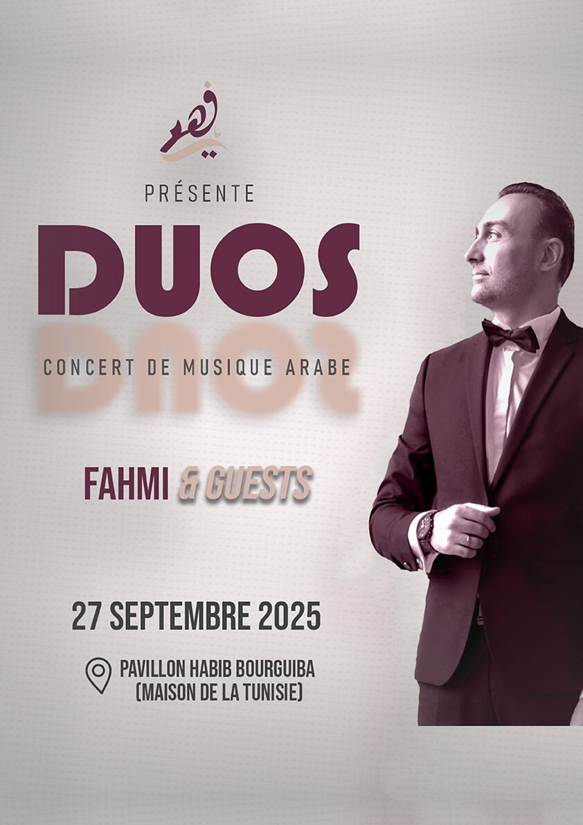 DUOS est né du partage : partage de ma passion pour le chant avec des artistes musiciens aussi bien talentueux que passionnés, partage d’une vision artistique avec des compagnons de longue date. Vous allez savourer de belles musiques que vous aimez, un mix des chansons de l’âge d’or de la musique arabe (Warda, Abdelhalim, Karem Mahmoud, OmKalthoum…) passant par les répertoires de George Wassouf, Ragheb Alama et Melhem Baraket. Le répertoire comtemporain sera aussi à l’honneur avec des reprises des plus belles chansons de Saber Rebai, Assala, Bouchna9… refaites toutes à notre sauce.