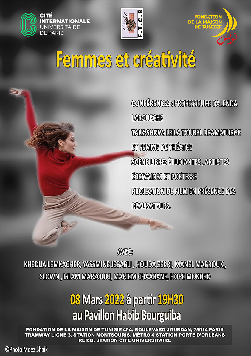 A l’occasion de la journée internationale des droits des femmes, La Fondation de la Maison de Tunisie en partenariat avec la FTCR ont le plaisir de vous inviter à une soirée culturelle sur le thème : Femmes et créativité, et ce le 08 Mars 2022 à partir de 19H30.
