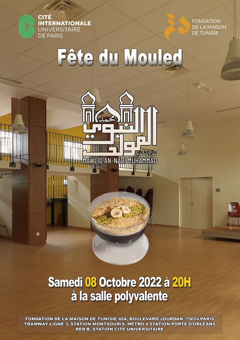 La fondation de Maison de Tunisie a l’immense plaisir de vous inviter à Fête du Mouled le Samedi 08 Octobre 2022 a 20H à la terrasse Ibn Khaldoun de la fondation de la Maison de Tunisie.