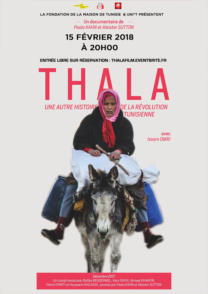 La fondation de la Maison de Tunisie et l’association UNI*T ont le plaisir de vous inviter à la projection du film « THALA, une autre histoire de la révolution tunisienne » de Paolo Kahn et Aleister Sutton