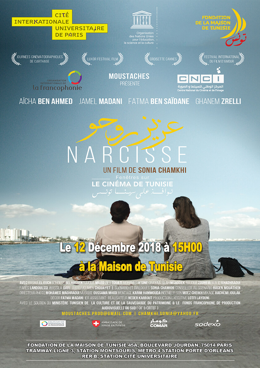 La Fondation de la Maison de Tunisie a le plaisir de vous inviter, et dans le cadre de la première édition de « Fenêtres sur le cinéma de Tunisie » En Partenariat avec la délégation Tunisienne permanente auprès de UNESCO, OIF, le CNCi. à la projection du film Narcisse en présence de la réalisatrice de Sonia Chamkhi.
