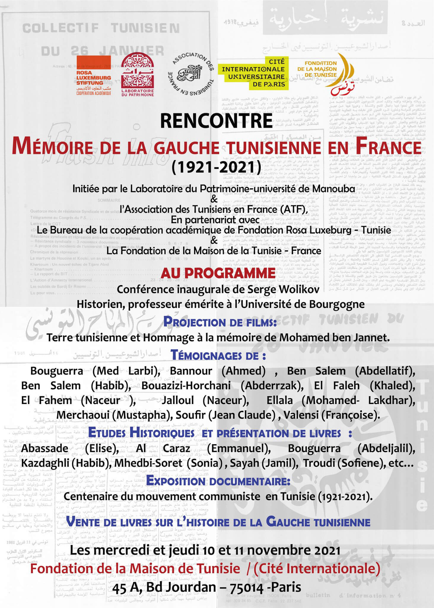 La Fondation de la Maison de Tunisie a le plaisir de vous inviter à la rencontre : mémoire de la gauche Tunisienne en France le 10 et le 11 novembre 2021 à la Maison de Tunisie.