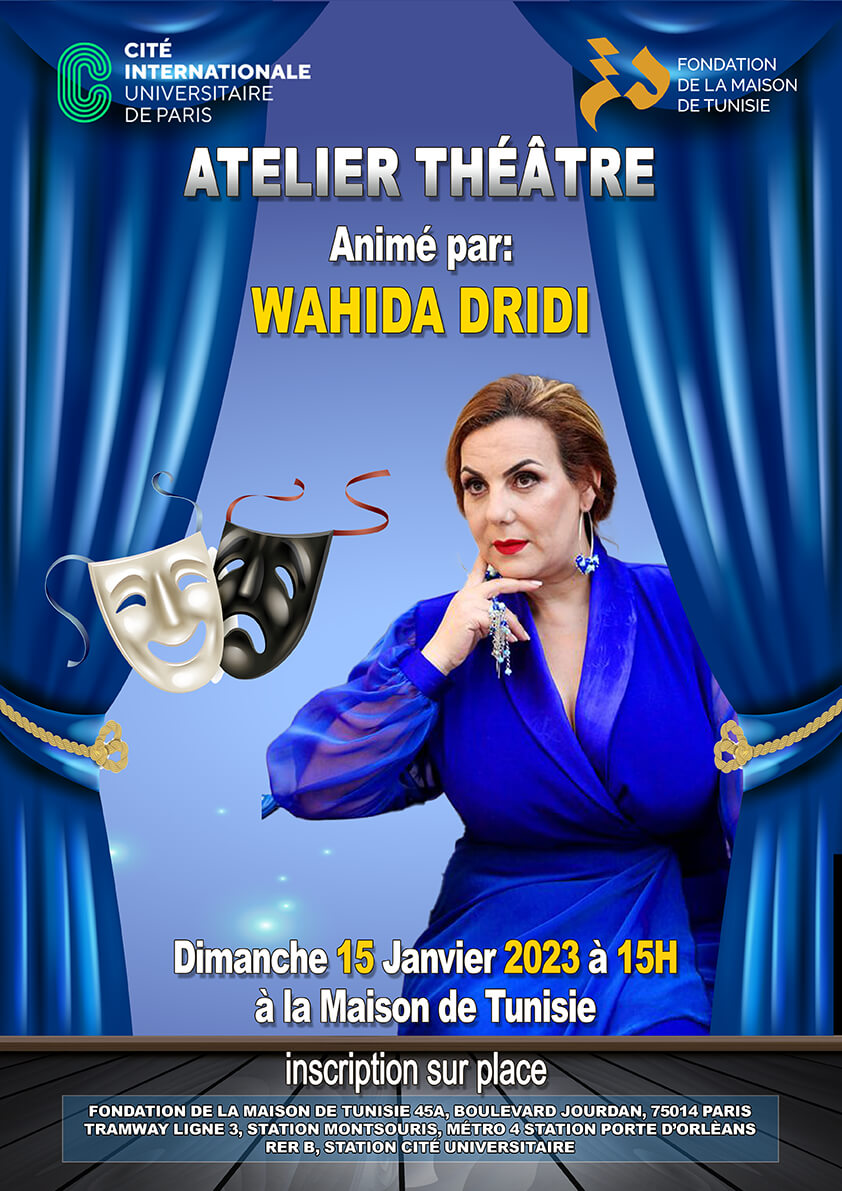 La Fondation de la Maison de la Tunisie a le plaisir de vous inviter a l’atelier théâtre de Wahida Dridi qui se déroulera le dimanche 15 octobre Janvier à 15H00 à l’amphithéâtre Habib Bourguiba de la Maison de Tunisie.