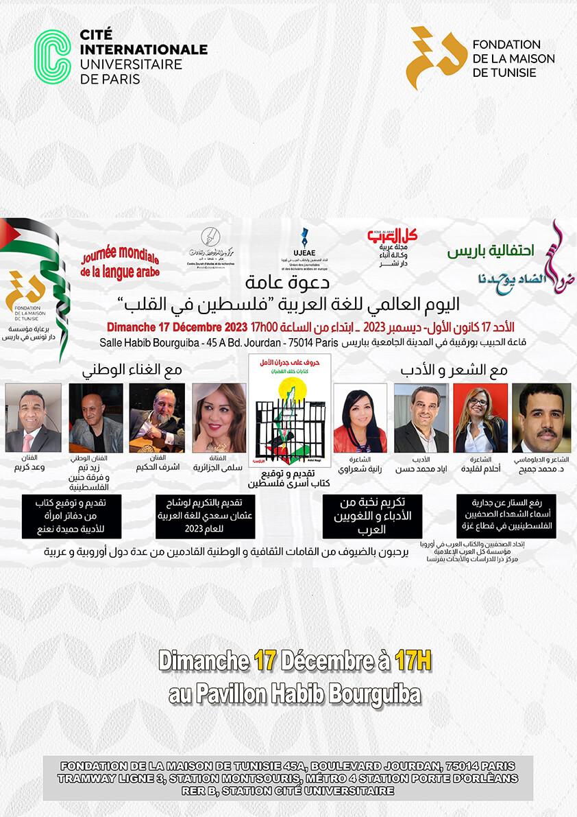 Dimanche17 décembre à partir de 17h au pavillon Habib Bourguiba , Fondation de la Maison de Tunisie à Paris.