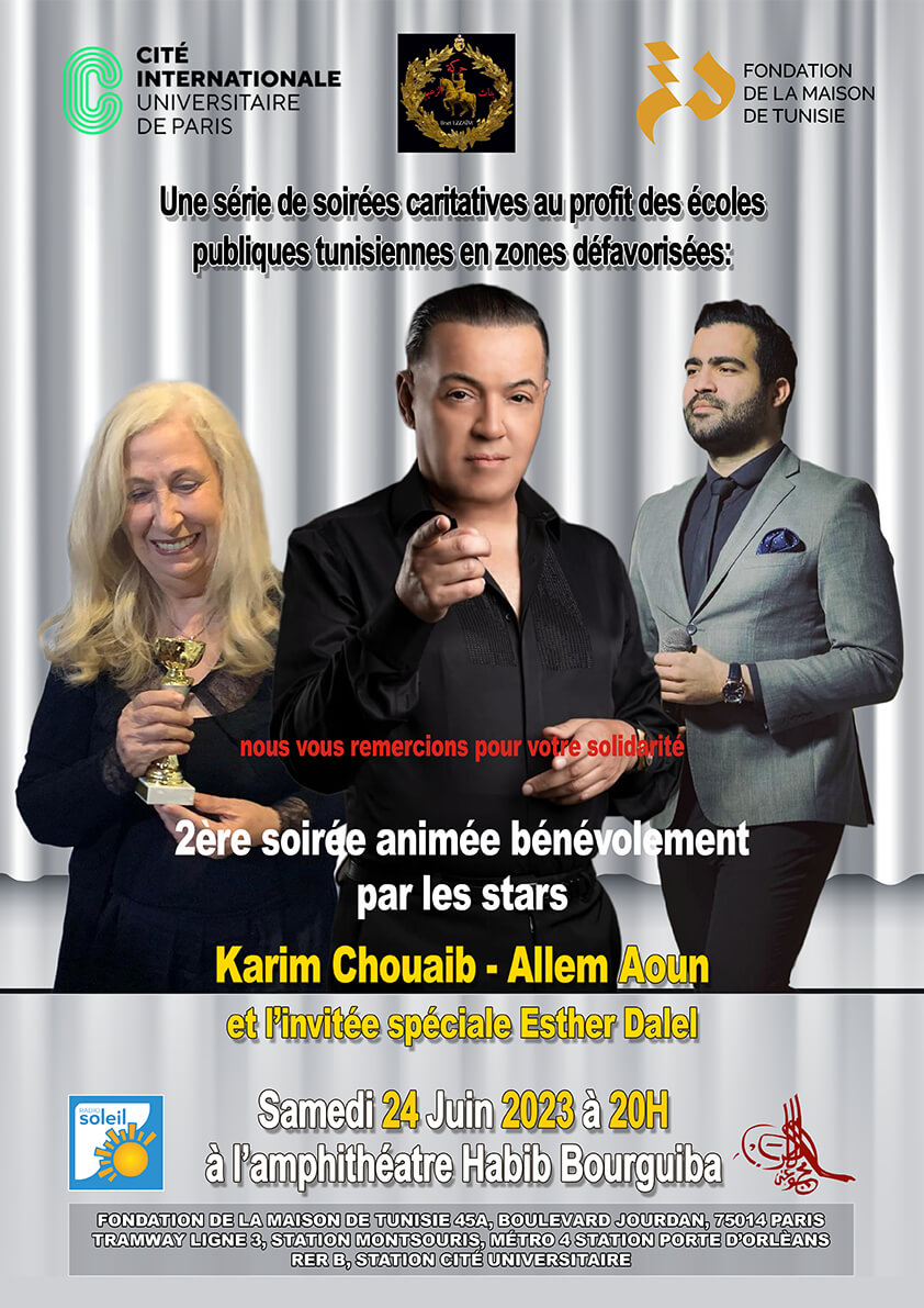 Nous sommes ravis de vous annoncer notre prochain évènement caritatif dédié à l’éducation des enfants des régions défavorisées en Tunisie. Rejoignez-nous pour une soirée inoubliable, le 24 juin 2023 à 20h à l’amphithéâtre Habib Bourguiba – Fondation de la maison de la tunisie, où nous nous unirons pour soutenir cette noble cause.