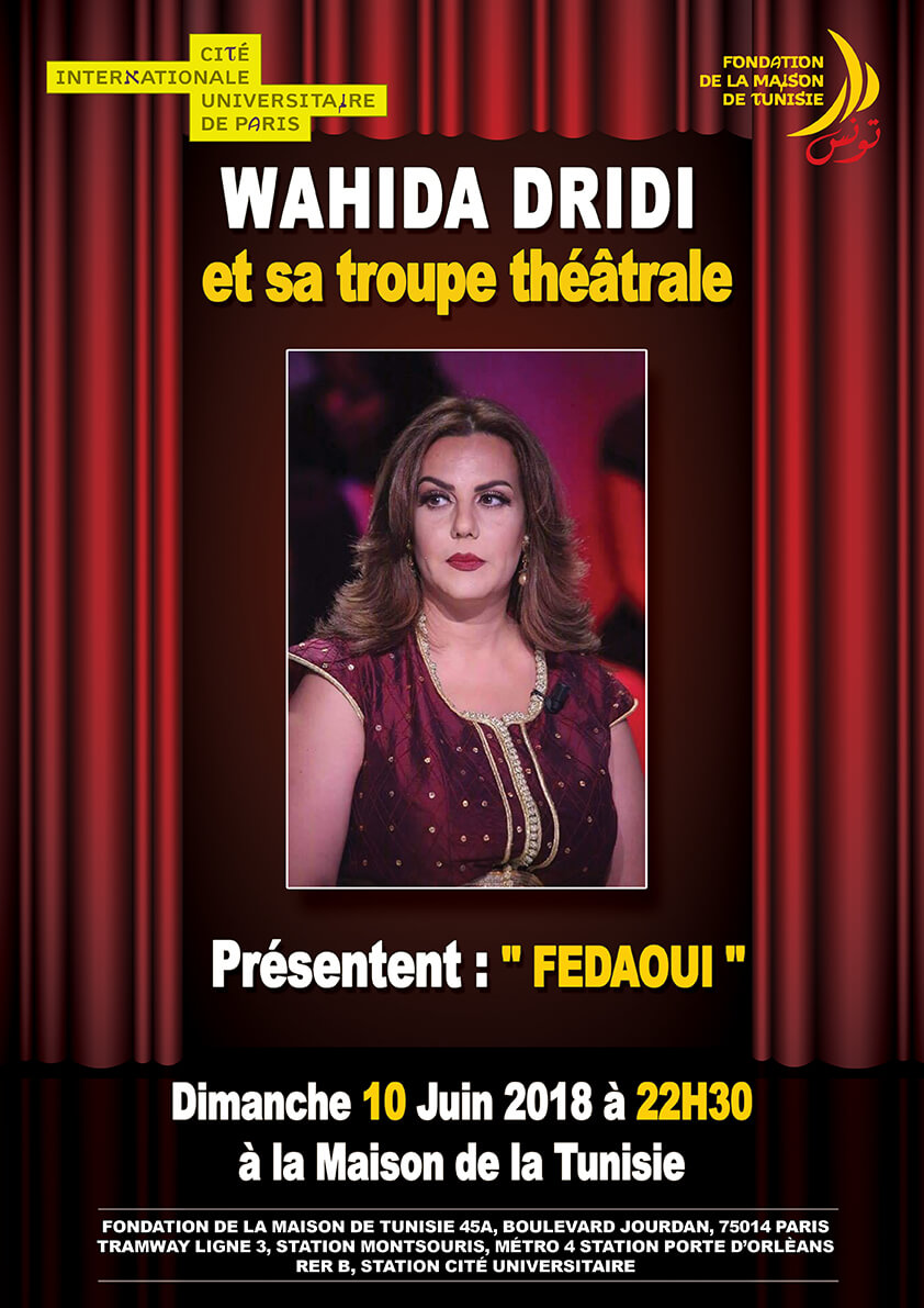 La Maison de Tunisie a le plaisir de inviter à la pièce de théâtre intitulée « Fedaoui » de Wahida Dridi et sa troupe Théâtrale