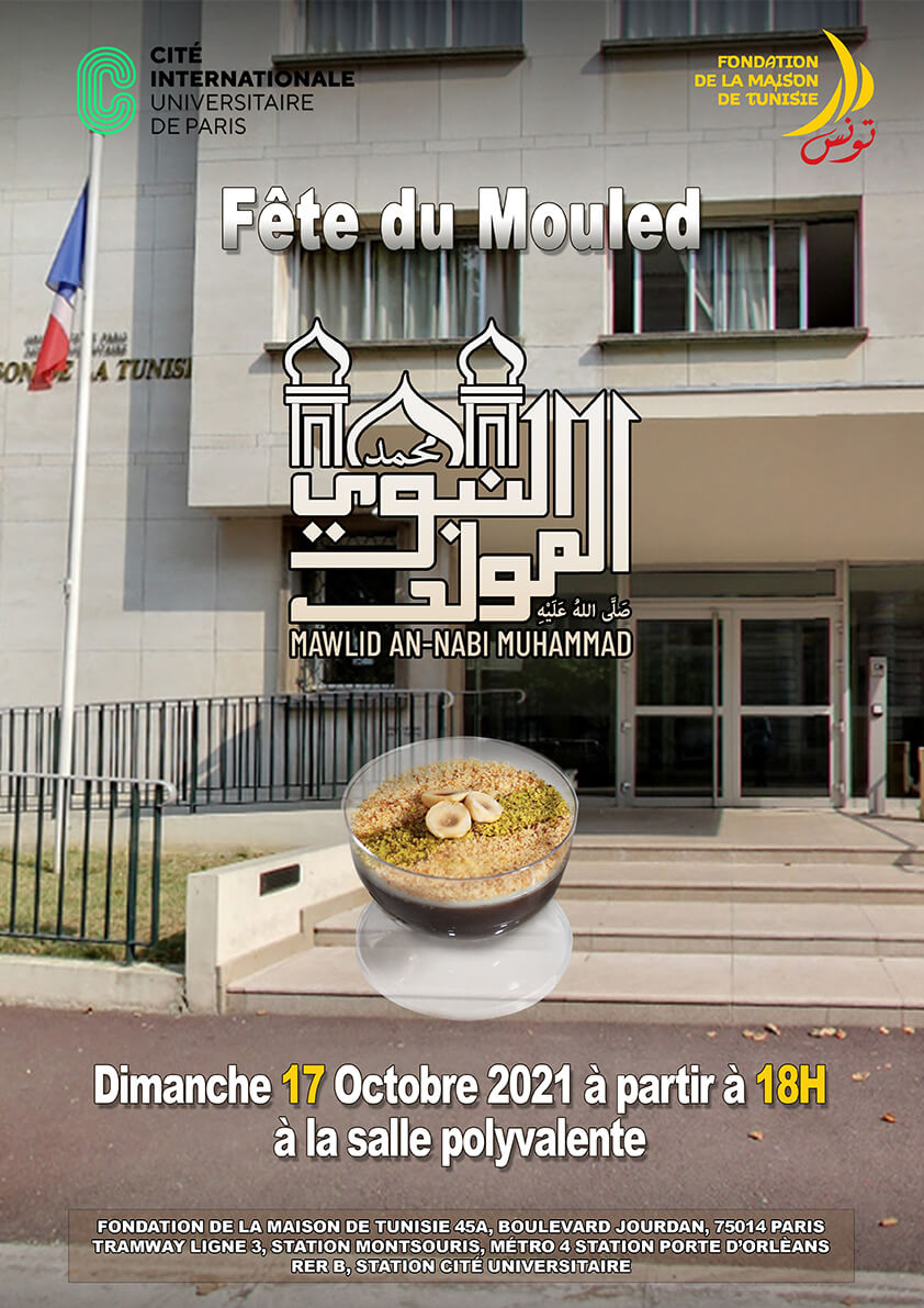 A l’occasion de la fête du Mouled, les residentes et résidents de Fondation de la Maison de Tunisie sont invités à la cérémonie qui aura lieu à la salle polyvalente ibn khaldoun le Dimanche 17 Octobre 2021 à partir de 18h.