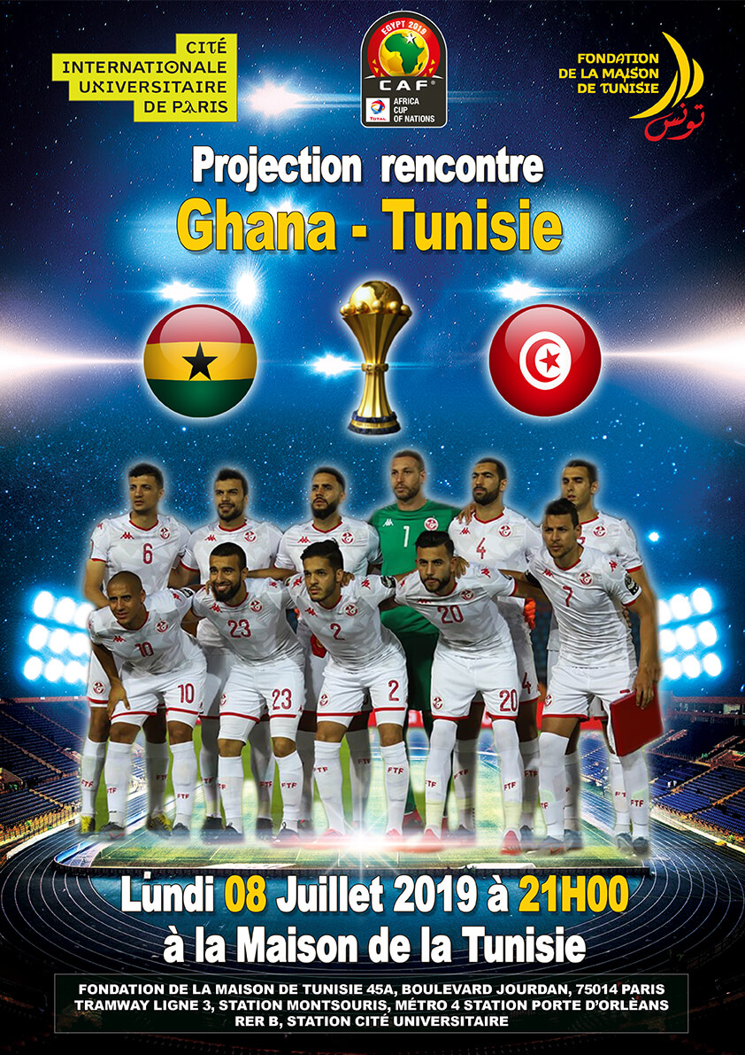La Fondation de La Maison de Tunisie à le plaisir de vous inviter à la Projection de la Rencontre CAF 2019 huitième de finale: Ghana – Tunisie