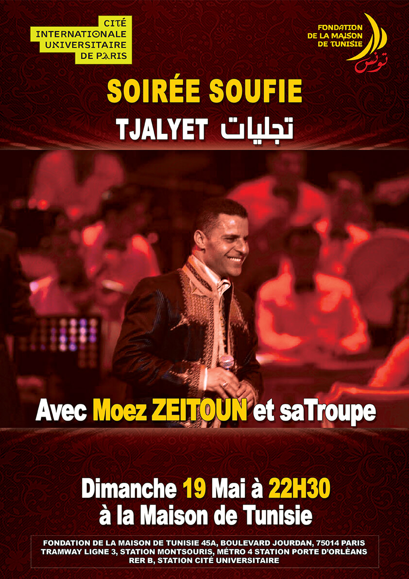 La Fondation de la Maison de Tunisie à le plaisir de vous inviter à une soirée Ramadanesque de musique Soufie avec le Monched Moez Zeitoun et sa troupe.