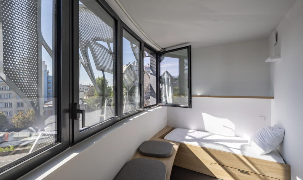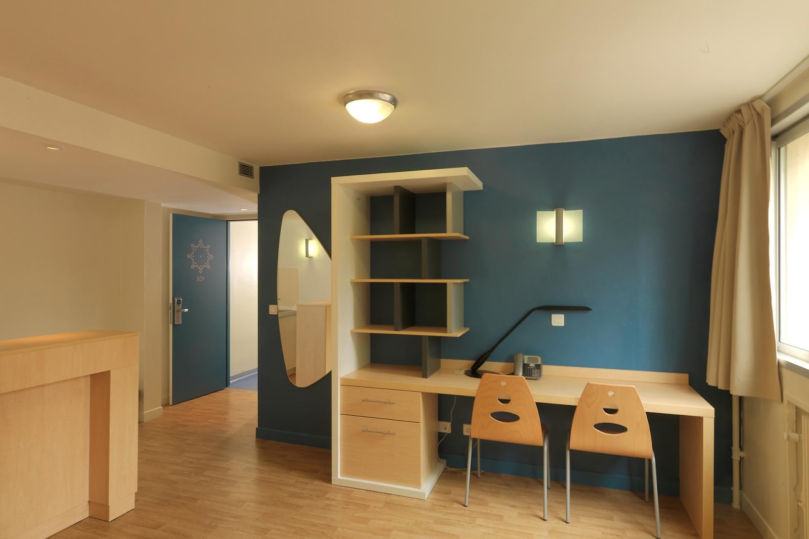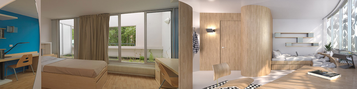 15 m² | Tarif : à partir de 479 € | salle d’eau avec douche et WC, lit, placard, bureau, lampes, étagères et accès Internet (câble et Wifi), cuisine en commun à chaque étage pour le pavillon Ibn Khaldoun et cuisine collective et salle à manger au 1 étage pour tous les résidents du pavillon Bourguiba.