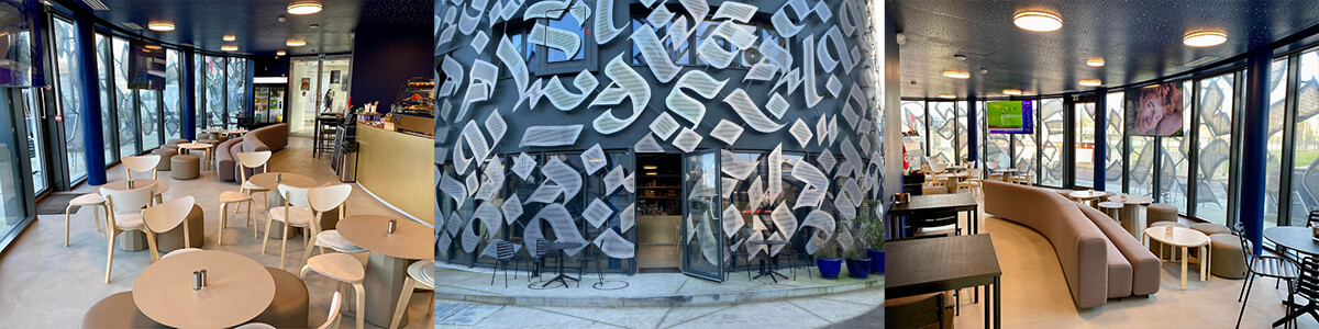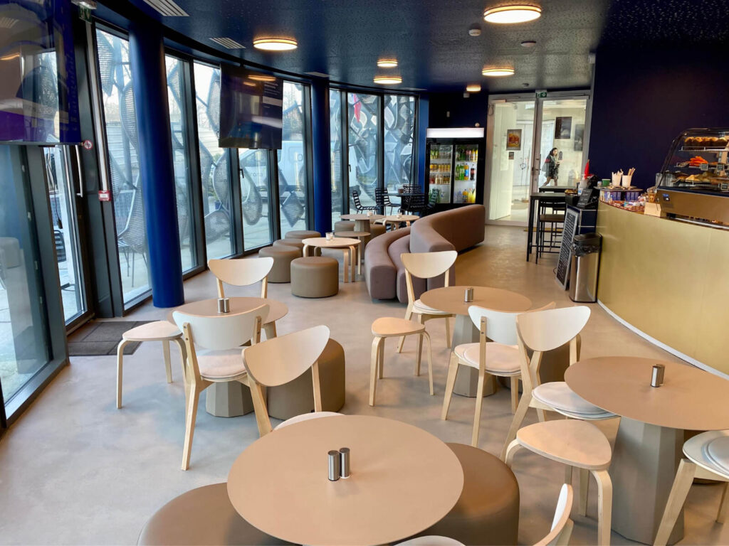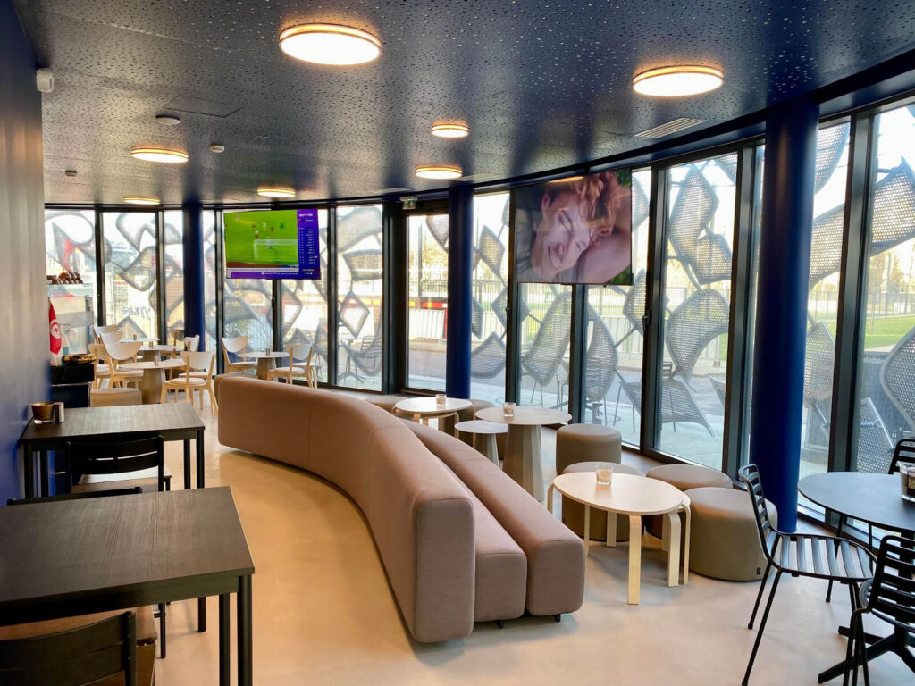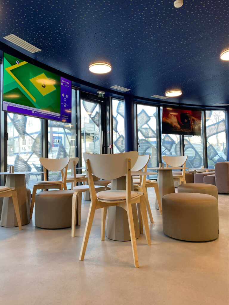 Le salon de thé est implanté sur le parvis d’entrée et il est accessible directement depuis l’extérieur. Il bénéficie d’une très bonne visibilité depuis le parc de la Cité internationale.