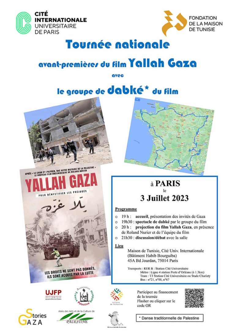 19 h : accueil, présentation des invités de Gaza19h30 : spectacle de dabké par le groupe du film20 h :