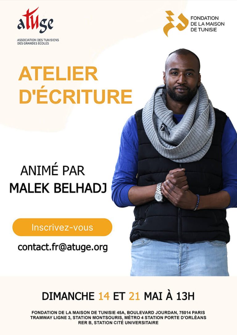 ATUGE Culture vous propose un atelier d’écriture sous la direction du scénariste Malek Belhadj. Dimanche 14 et 21 Mai 2023