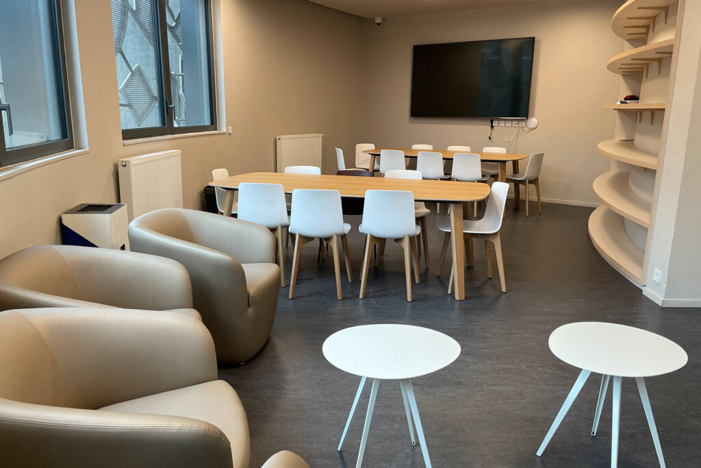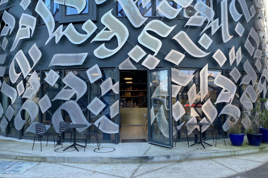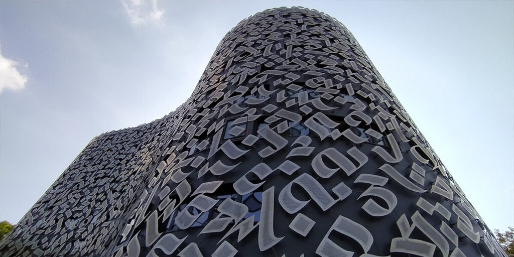 Cette façade évoque tout autant la calligraphie arabo-musulmane que la tradition du moucharabieh dans l’architecture tunisienne. Elle est constituée de panneaux métalliques découpés au laser qui sont fixés devant les fenêtres et les allèges.