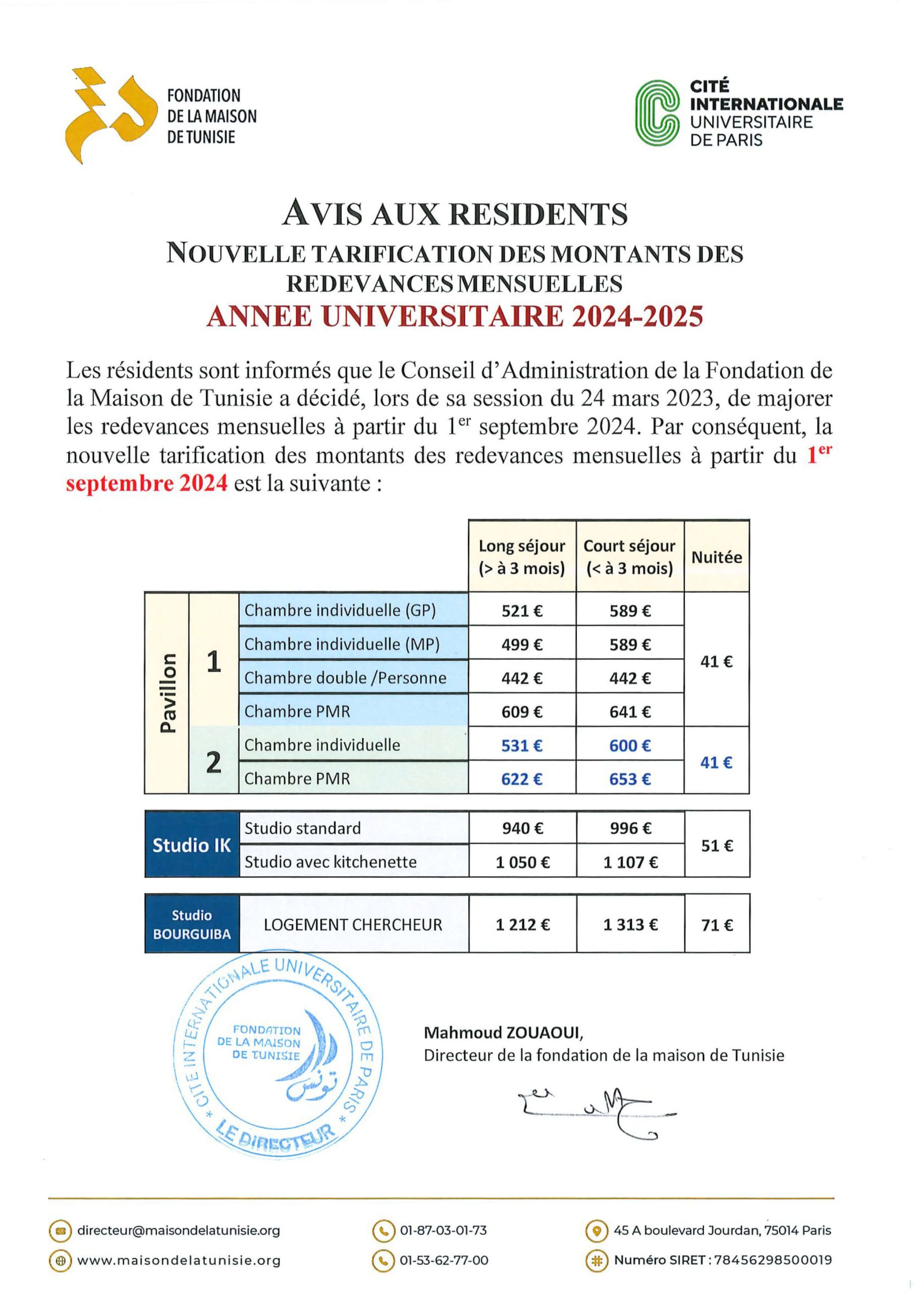 Nouvelle Tarification des Montants des Redevances Mensuelles pour l’Année Universitaire 2024-2025