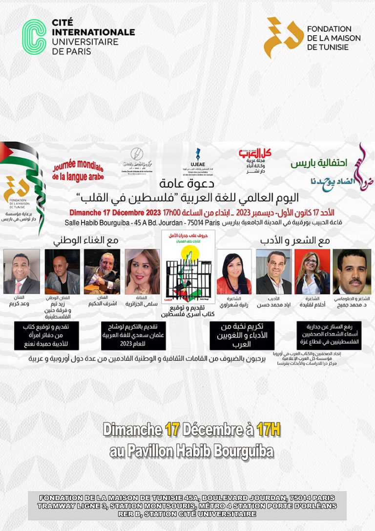 Dimanche17 décembre à partir de 17h au pavillon Habib Bourguiba , Fondation de la Maison de Tunisie à Paris.