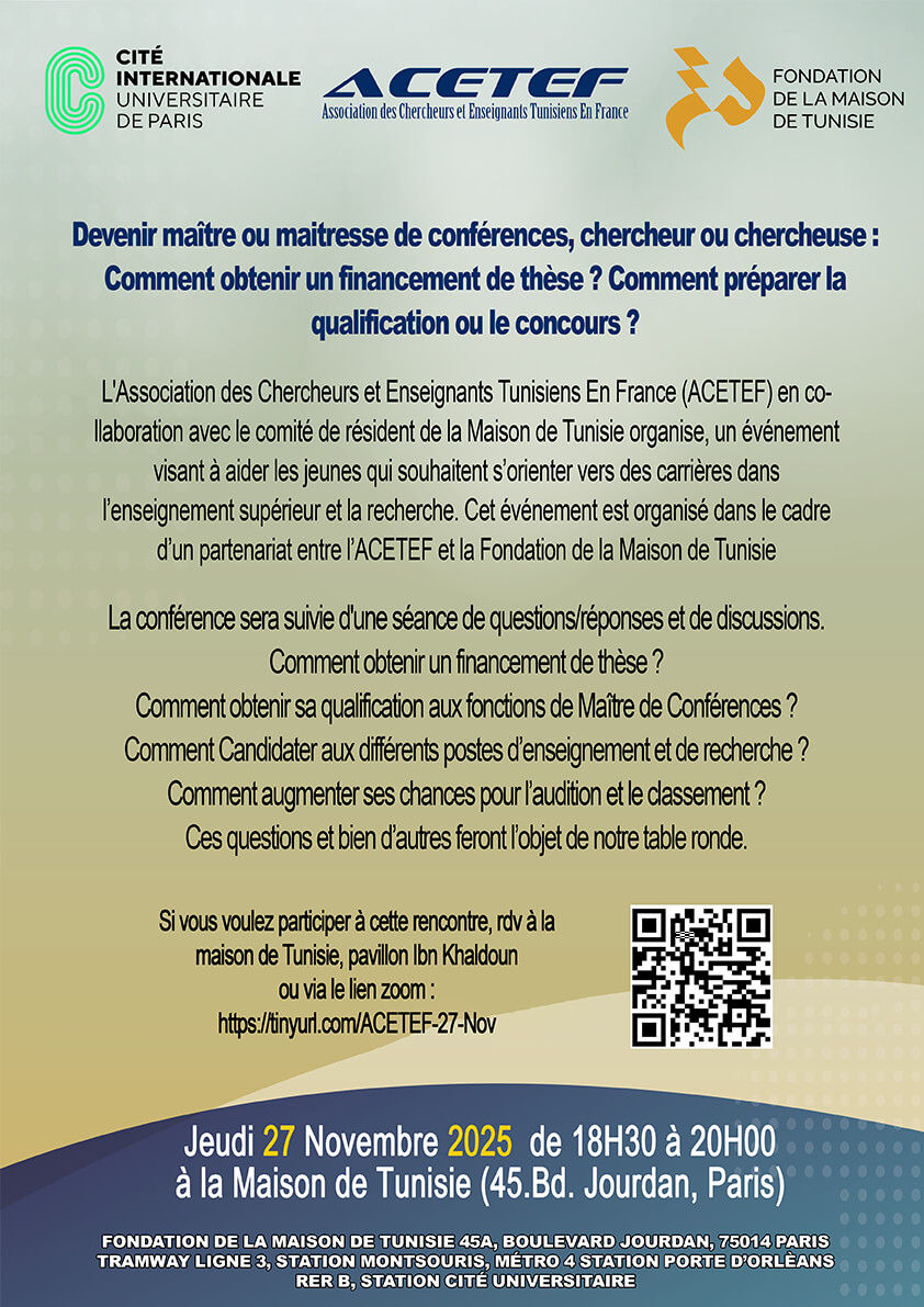 Association des Chercheurs et Enseignants Tunisiens En France (ACETEF) organise, dans le cadre de son partenariat avec la Fondation de